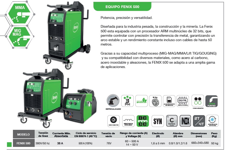 La FÉNIX 500 está diseñada para los trabajos más exigentes de industria pesada, construcción y minería. Su potencia constante de 500 amperes al 100% permite soldar durante horas sin interrupciones.
